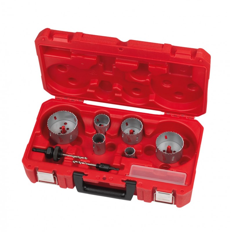 6 scies cloches : Ø 25, 32, 40, 54, 68, 76 mm. Arbre pour Ø 14 à 30 mm. Arbre pour Ø 32 à 152 mm. 2 forêts pilote, 1 clé allen