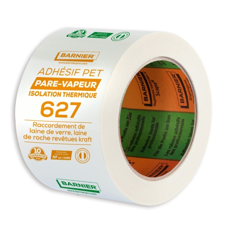 Ruban adhésif simple face PET blanc. Jointage de panneaux d'isolation (revêtus kraft). Produit testé suivant la norme NF en 12086.