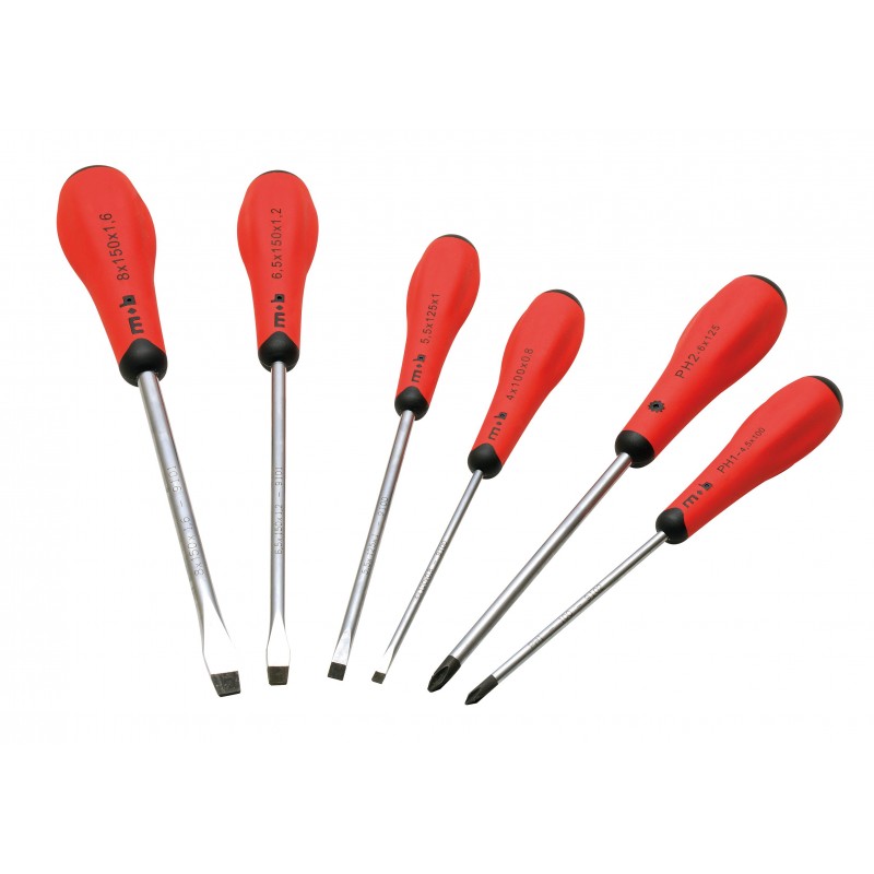 Force, précision, rapidité. Combinaison de 2 matières : néoprène et polypropylène. Un couple très puissant grâce à la forme hexalobée. Les 6 lobes calent les doigts naturellement lors des serrages puissants. Qualité : lame surmoulée indémanchable. Rapidité : amincissement du corps du tournevis pour le serrage rapide. Les avantages d'un tournevis à corps rond : forme adaptée à votre main, mouvement de reprise naturel. Les avantages d'un tournevis à corps carré ou triangulaire : développement d'un couple puissant sans effort de serrage exagéré. Posé, ne roule pas. Pratique : grande visibilité de la couleur rouge, impossible à perdre. Néoprène nouvelle génération : facile à nettoyer. Tête sphérique douce : forme adaptée à la poussée. Marquage avec code couleur pour un repérage facile. Une qualité d'acier pour chaque empreinte : pour les tournevis à fente, les tournevis à empreinte de type Phillips et Pozidriv, acier allié au chrome et au vanadium. Pour les tournevis adaptés aux empreintes de type Torx : acier allié au manganèse et au silicium adapté uniquement aux usages de ce type d'empreintes. Marquage par tampographie de couleur sur le dessus du manche. Double marquage de la dimension : tampographie latérale sur le manche et marquage laser sur la lame. Finition : lame de finition chromée satinée. Empreinte phosphatée pour une meilleure adhérence.