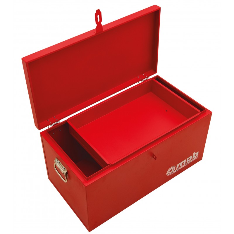 Qualité de tôle épaisse pour une grande rigidité. 2 poignées. 1 fermeture. Cadenassable (Ø 10 mm). Plateau amovible coulissant. Ouverture du couvercle à 90°. 670 x 350 x 350 . 80 L.