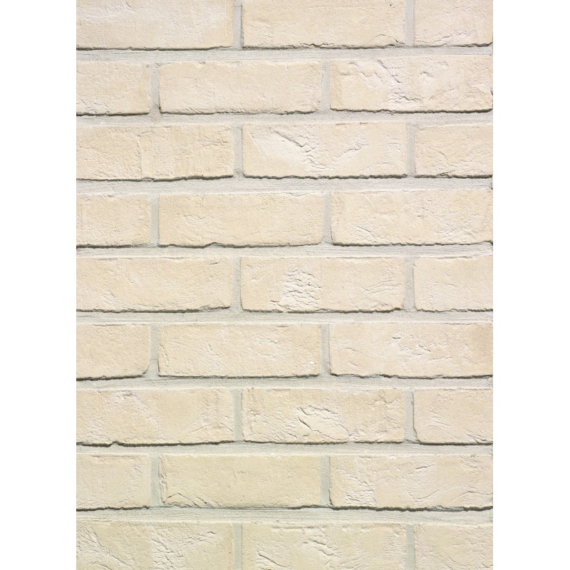 Brique moulée main aux arêtes irrégulières de couleur blanche, légèrement nuancée.
