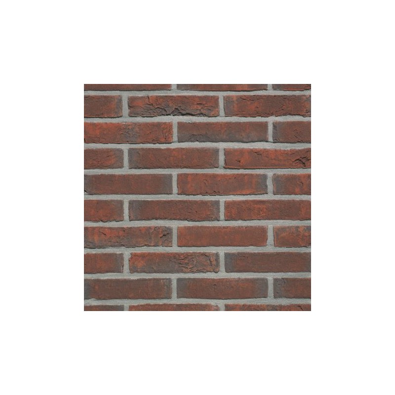 Brique moulée main aux arêtes irrégulières de couleur rouge avec tâches de réduction bleu et pourpre et nuancée de rouge-orangé.