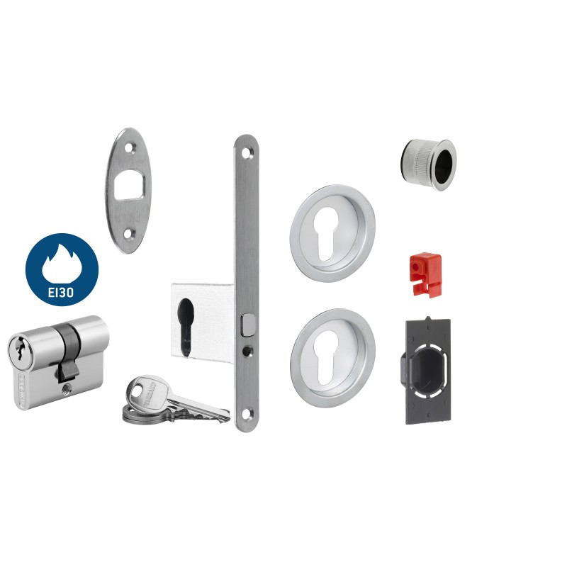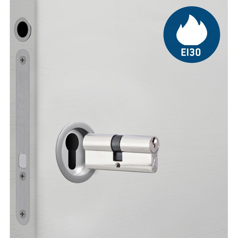 Serrure EI30 à cylindre européen ronde chrome satiné. Contenu : cylindre (21x21), clés, serrure, 2 poignées (Ø60mm), gâche, tire-doigt (Ø29mm), membrane intumescente, gabarit de pose et visserie. Montage simple et rapide. Pour porte coupe-feu INITIAL EI30 avec usinage mortaise EI30.