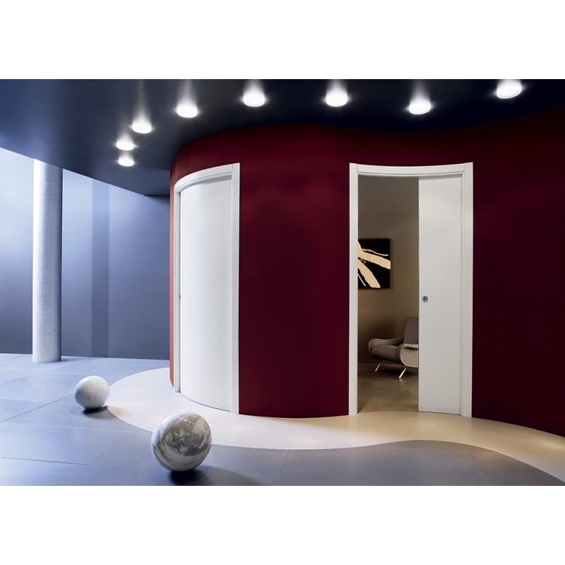 Hauteur de porte hors-standard de 1000 à 2600 mm. Largeur standard uniquement soit 630 à 1030 mm. Rayon de 1000 à 5000 mm. Pour porte bois incurvée jusqu’à 80 kg. Existe en version plaques de plâtre ou à enduire, à un ou deux vantaux. Épaisseur de cloison finie : 125 mm. Nécessite un habillage de finition.