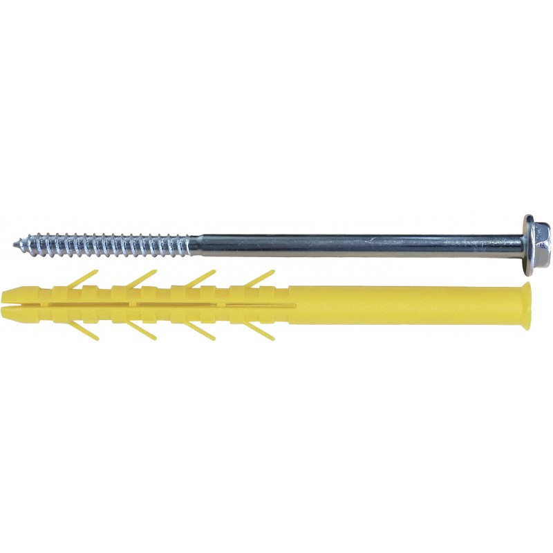 Cheville longue Ø 10 avec tirefond (tête hexagonale + empreinte Torx T40) avec rondelle soudée Ø 7 mm. Applications : équerres de fixation, bardages, pattes de radiateurs, etc... Longueurs 80 à 200 mm.