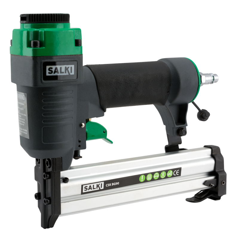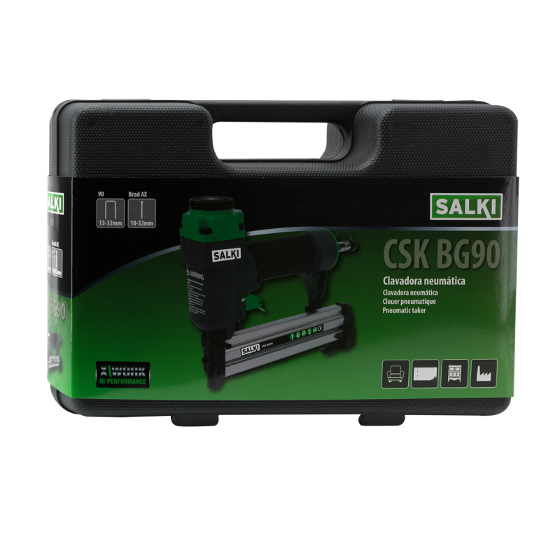 Agrafeuse pneumatique. Consommables : Agrafes 90/13 - 32 mm ou pointes Brad AX 10 - 32 mm. Pression de travail : 60 - 110 Psi (4 - 7 Bar). Poids : 1,6 Kg. Capacité du chargeur : 100 agrafes/clous. Gabarit : GA18 (1,05x1,25 mm)