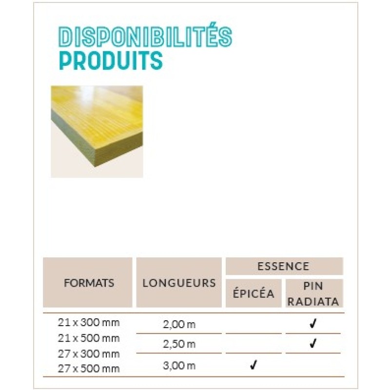 ÉPICÉA. Composition : 100% Épicéa. Face : choix B.PIN RADIATA. Composition : 100% Pin Radiata. Face : choix B.