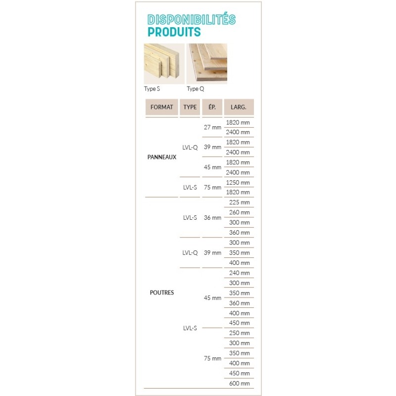 • Dans le cas de poutres très élancées, d’applications en format panneau à plat, ou si le risque de tuilage est important (usage muralière par exemple), le LVL-Q à plis croisés est à privilégier.