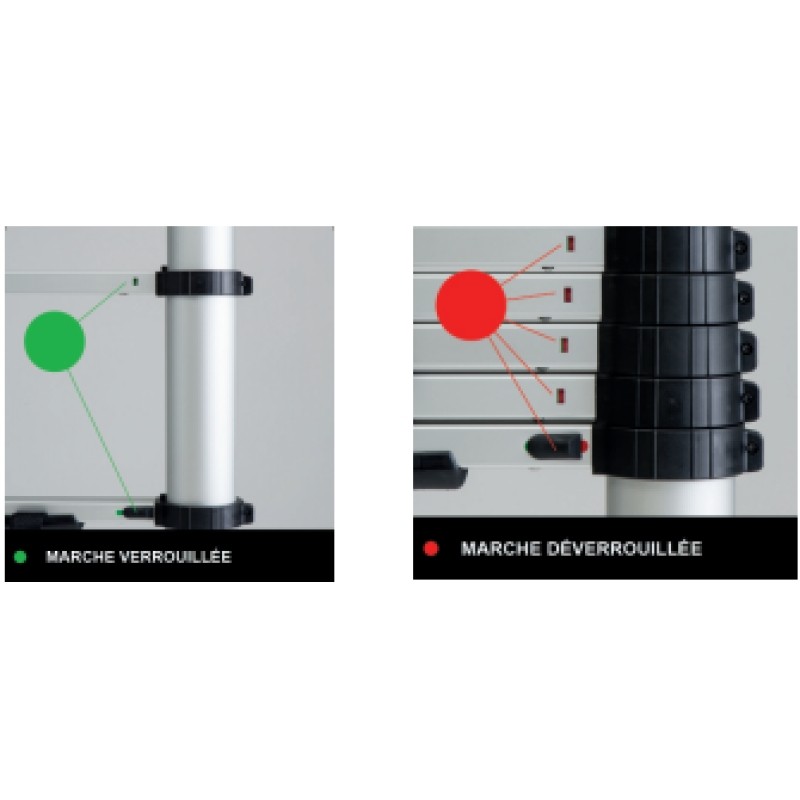 En aluminium anodisé avec système de coulissage par air. Marche extra-larges. Barre stabilisatrice. Hauteur dépliée 3.23m. Dimension pliée 90 x 86cm. 11 Échelons