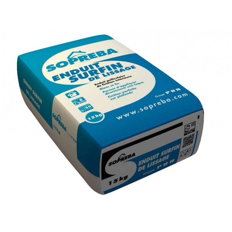 L'ENDUIT SURFIN DE LISSAGE est un enduit pelliculaire de finition intérieure, en poudre, prêt à gâcher. Enduit pelliculaire de finition intérieure (plafond et mur intérieur). Disponible en 25, 15, 5, 1,5 kg.