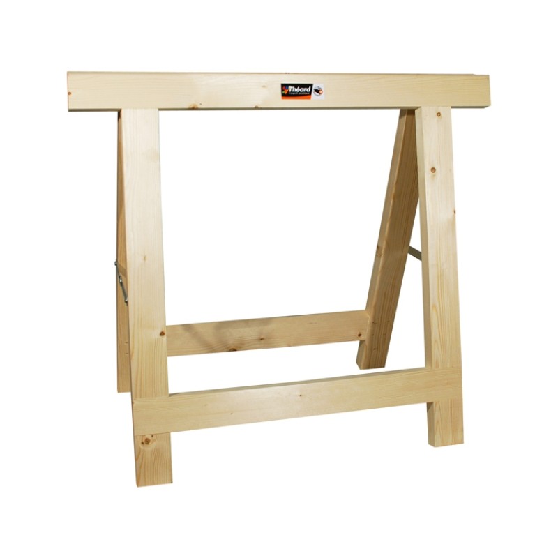 Tréteau en bois épicéa fabriqué par THEARD. Section 70 x 35 mm. Testé à 2000 kg (charge maximale répartie sur 2 tréteaux). Blocage par compas acier zingué. Épaisseur replié : 75 mm. Poids : 7,360 kg.
