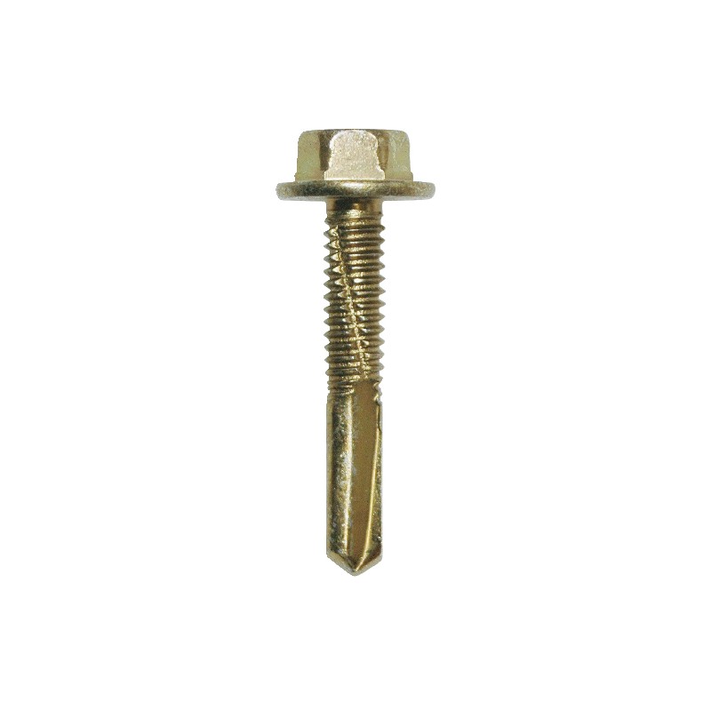 Vis autoperceuse tête hexagonale (6 pans de 10) Ø 6 x 35. Pointe foret + collerette large Ø 15 mm. Matière : acier zingué bichromaté jaune. Capacité de perçage : 4 à 15 mm. Fixation bac support d'étanchéité sur panne métallique.