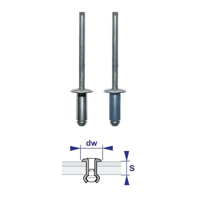 Rivet alu/acier NE - Corps laqué Ø 4,8 x 12. Matière : rivet aluminium & mandrin acier zingué. Couturage des bacs support d'étanchéité par rivetage.