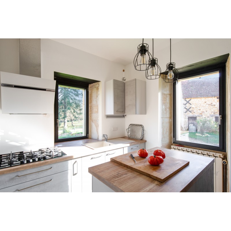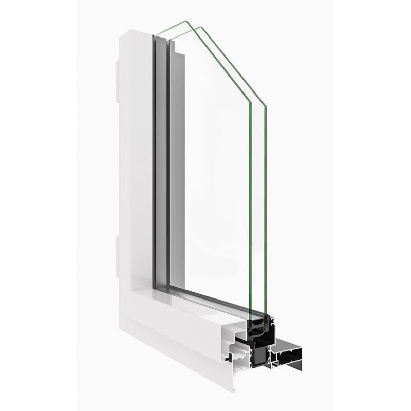 Fenêtre à dormant visible en aluminium à rupture de pont thermique de 73mm d'épaisseur. Ouvrant en acier soudé  sans coupe d'onglet visible de 75mm d'épaisseur. Profils visibles ultra réduits : ouvrant de 45mm (85mm sur montant de portes fenêtres serrure), battement central de 60mm. Drainage des eaux de pluie masqué. Disponible en grandes dimensions, jusqu'à 2.65m sans imposte. Stores vénitiens en option.