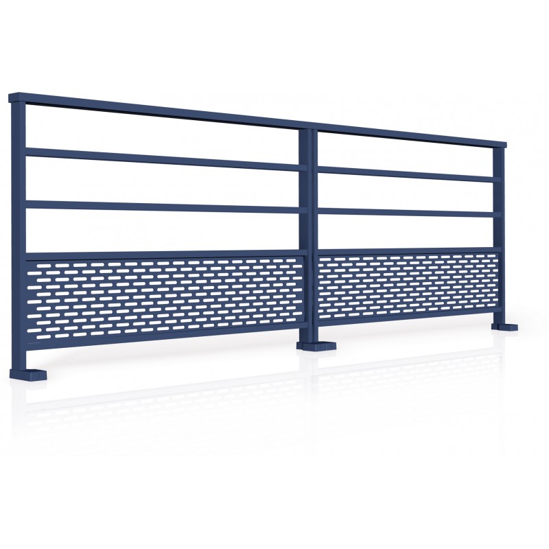 Garde-corps avec deux lisses intermédiaires : main courante de diamètre 74 mm ; lisses intermédiaires de 50 x 27 mm ; remplissage avec tôle décorative.