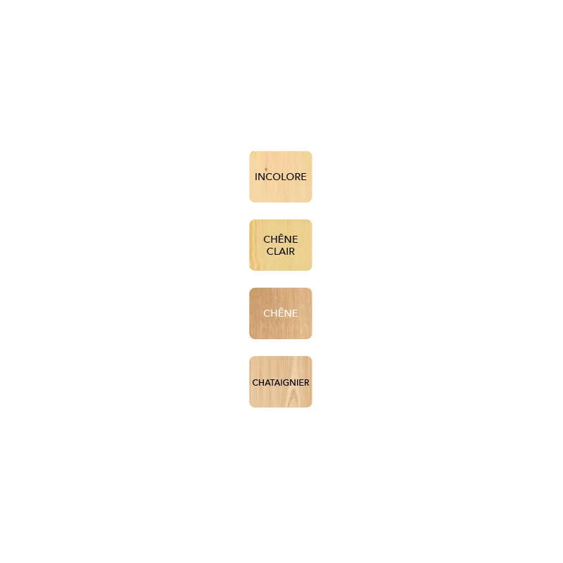 Disponible en 4 teintes : incolore, chêne clair, chêne, châtaignier.