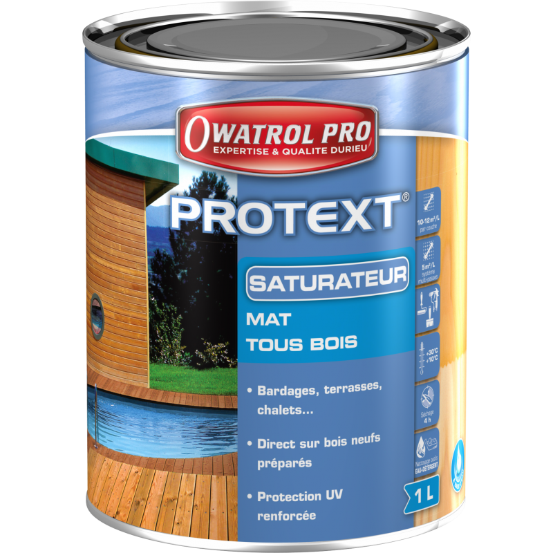 Saturateur mat à l'eau pour terrasses, bardages... Existe en 1 L, 5 L et 20 L en 7 teintes.