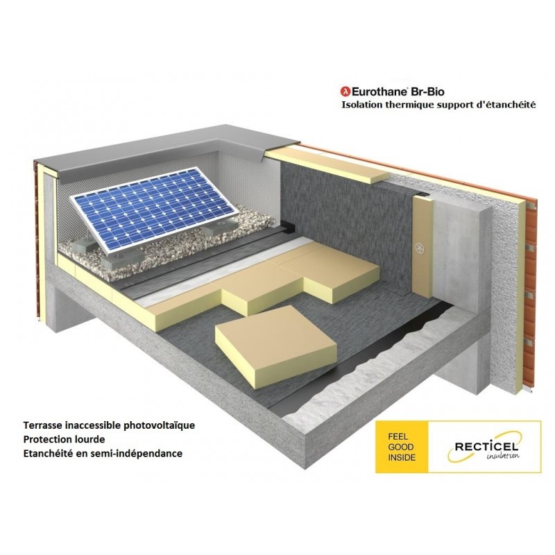 L'Eurothane Br-Bio® est un panneau d’isolation thermique destiné aux toitures terrasses avec étanchéité en membrane bitume modifié ou synthétique, uniquement sous protection lourde. Il est constitué d'une âme en mousse rigide de polyuréthane (PIR), revêtue sur chaque face d’un parement multicouche kraft apparent.