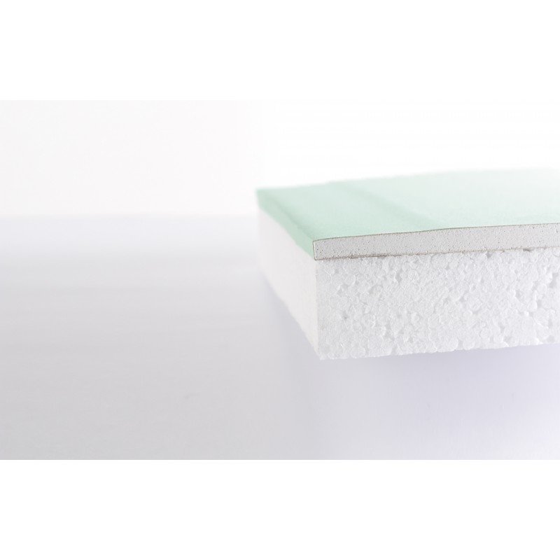 Complexes de doublage constitués d'un panneau isolant en polystyrène graphité ou blanc collé sur une plaque de plâtre à bords amincis de 13 mm standard, hydrofuge ou acoustique.