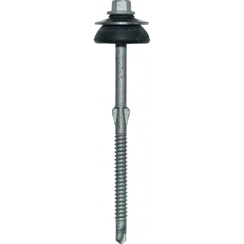 Vis autoperceuse à ailettes et Tête Hexagonale (6 pans de 8 mm) Ø 6,3 x 105. Matière : acier SUPRACOAT 2C + Rd. Inox Ø 22 / EPDM Ø 25. Résistance à la corrosion = 15 cycles Kesternich. Capacité de perçage : 1,5 à 4 mm. Fixation en sommet d'onde sur charpente acier.
