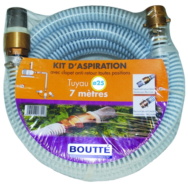 Kit aspiration complet composé de : - 1 clapet-filtre F. 26x34 (1") - 1 raccord laiton F. 26x34 (1") assemblé avec mamelon M. 26x34 (1") - 1 tuyau annelé Ø25 de longueur 7m - Matière : laiton, inox, PVC