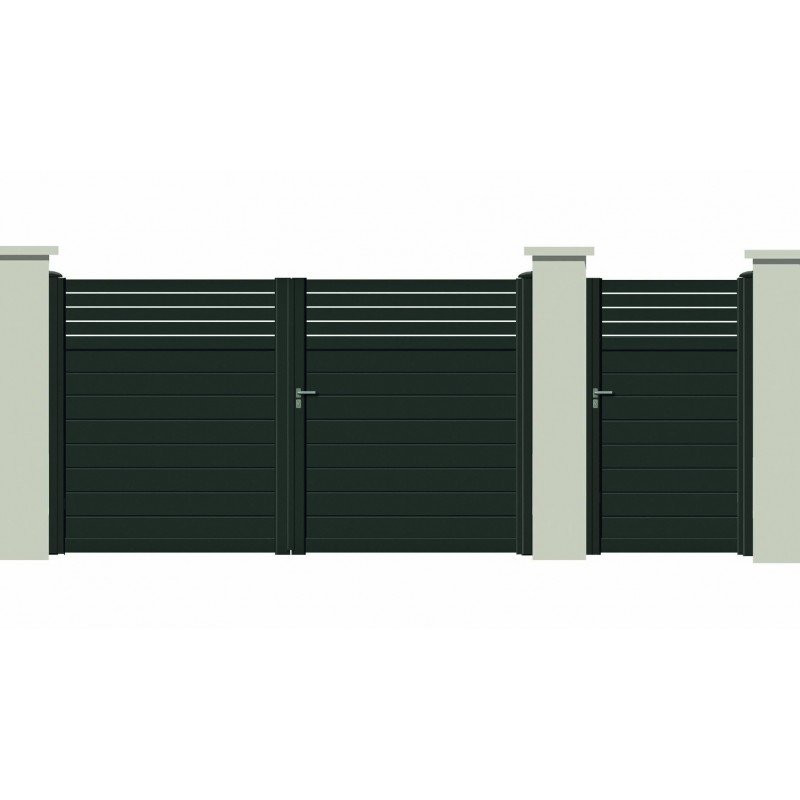 Portail battant ou coulissant : Lg 3.00 - 3.50 - 4.00m Ht 1.413m ou 1.563m ou 1.713m ou 1.863m. Portillon : Lg 1.00 - 1.25m Ht 1.413m ou 1.563m ou 1.713m ou 1.863m. Portail en aluminium avec lames horizontales + ajouré sur la partie haute. Livré avec équipement complet, disponible ral 9016 ou 7039 ou 7016. Norme CE, NF, fabrication française.