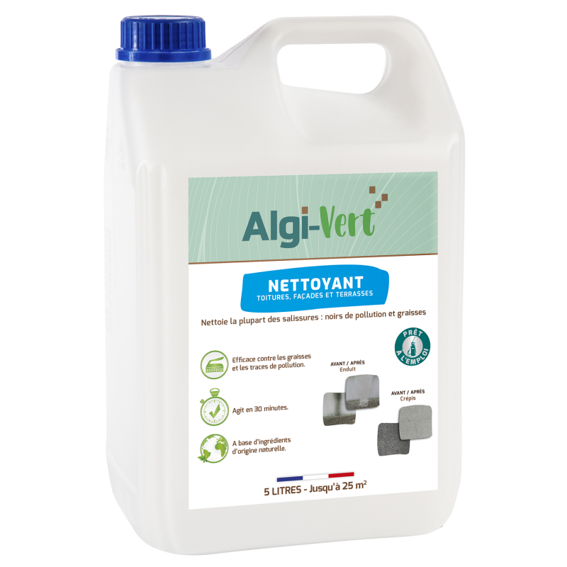 Nettoie en profondeur les noirs de pollution et les graisses sur les toitures, les façades et les terrasses.