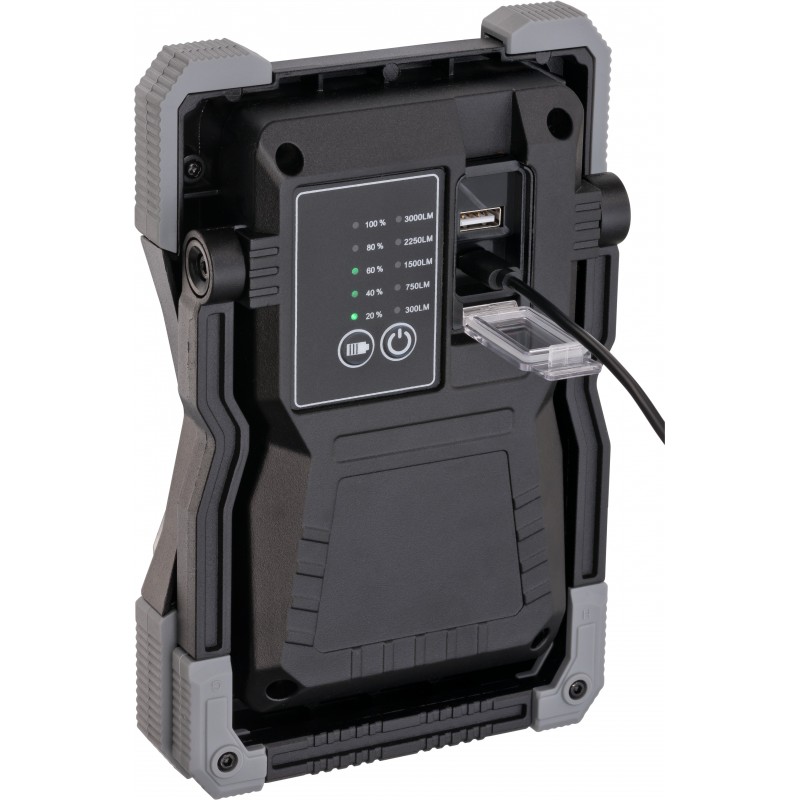 Contenu du colis : 1x Projecteur LED rechargeable RUFUS, 1500 lumen + 1x câble de raccordement USB + 1x batterie Li-Ion intégrée + 1x étui de rangement + 1x notice.