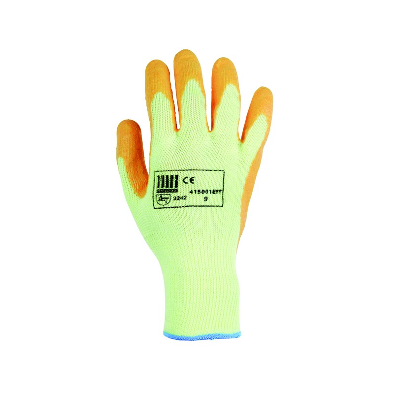 Gant tricoté 100% coton enduction latex orange sur la paume et les extrémités des doigts, dos aéré. Coloris : orange. Tailles : 7, 8, 9, 10 et 11. Conforme à la norme EN388 : 2016 2242X
