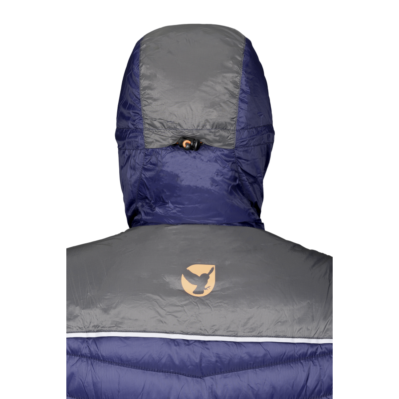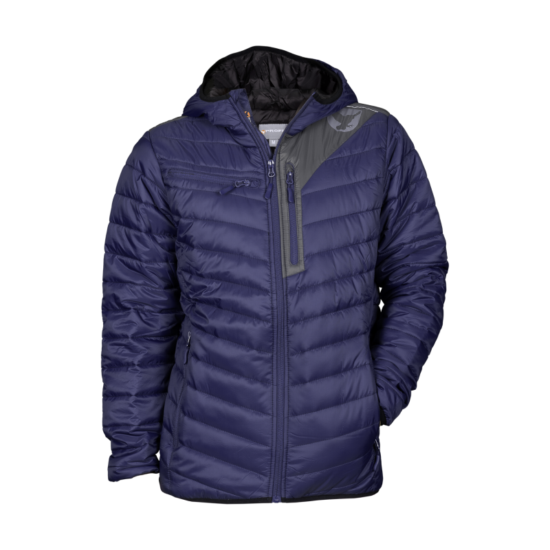 Tissu extérieur : 20D ripstop 100% nylon 35g/m2, enduction PU, matelassé 160 g/m2 sur le corps et 140 g/m2 en manche, doublure 100% nylon. Fermeture par glissière avec protection du menton. Multipoche : sur le devant 2 poches poitrine zippées, 2 poches chauffe-mains zippées, à l’intérieur 2 poches, biais de manche, taille et capuche élastiqués. Coloris : marine/gris.