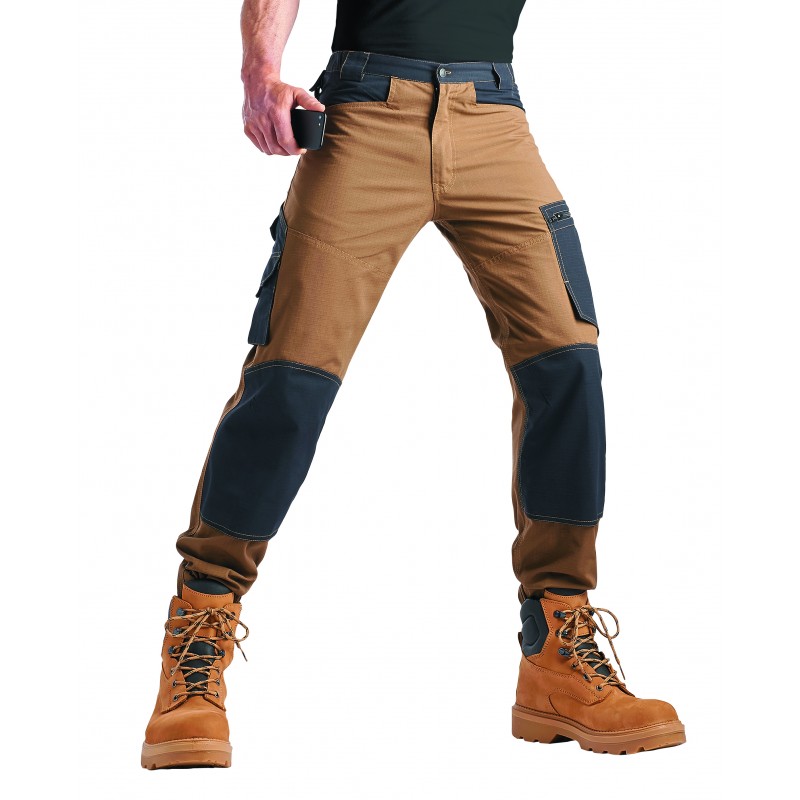 Pantalon en polyester/coton 235g/m² Ripstop. Ceinture 5 passants larges,1 passant avec bouton pression pour accrocher les gants. Ceinture élastiquée et fermée sur le devant par un bouton. Braguette fermée par un zip. Renforts d’entrejambe intérieur. Renforts des genoux ouverts par le bas permettant d’insérer les genouillères PROFIL réf. X16040801 conforme à la norme EN14404.Triple piqûre au niveau jambes intérieures. 2 Poches sur le devant et 2 poches plaquées au dos. Sur la cuisse gauche : poche fermée par zip à l’envers. Une poche porte-outils avec rabat sur la cuisse droite + une sangle porte-outils.