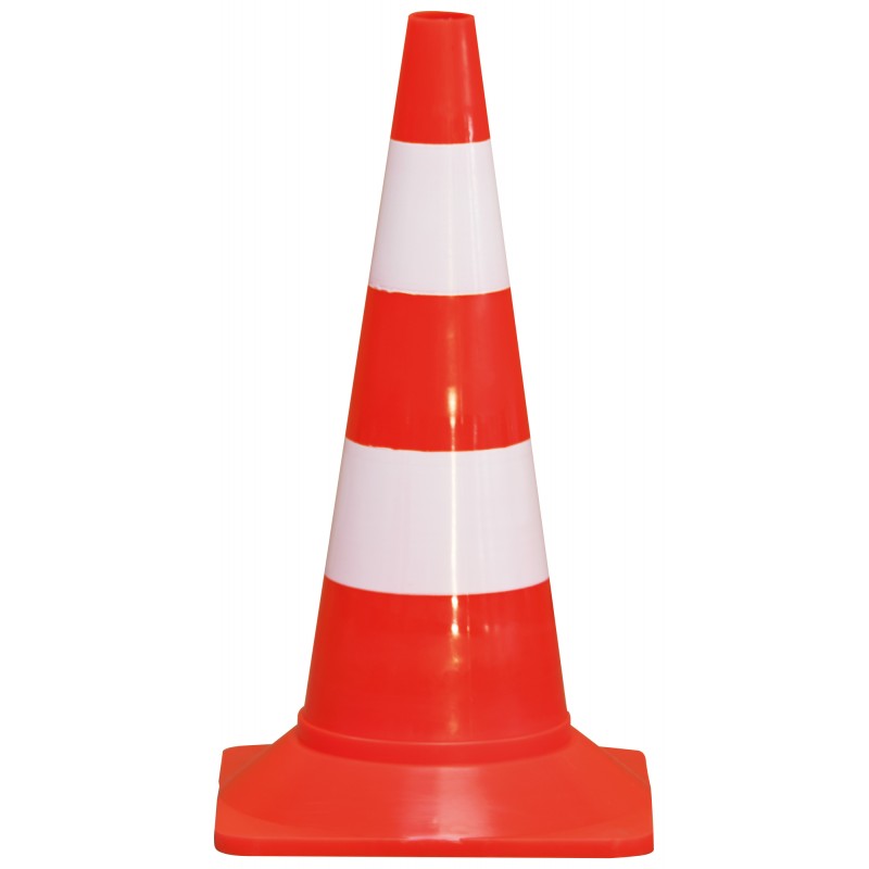 Cône plastique rouge fluorescent avec bandes blanches. PVC traité anti-UV. Emboîtable.