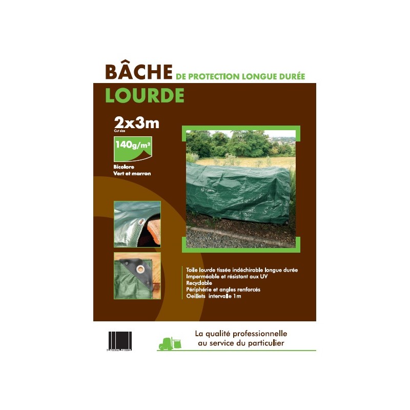 Bâche lourde 140 g/m². Dimensions 2 x 3 m. Toile imperméable, résistante aux UV, œillets aluminium intervalle 1 m, périphérie et angles renforcés, recyclable.