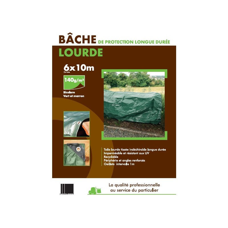Bâche lourde 140 g/m². Dimensions 6 x 10 m. Toile imperméable, résistante aux UV, œillets aluminium intervalle 1 m, périphérie et angles renforcés, recyclable.