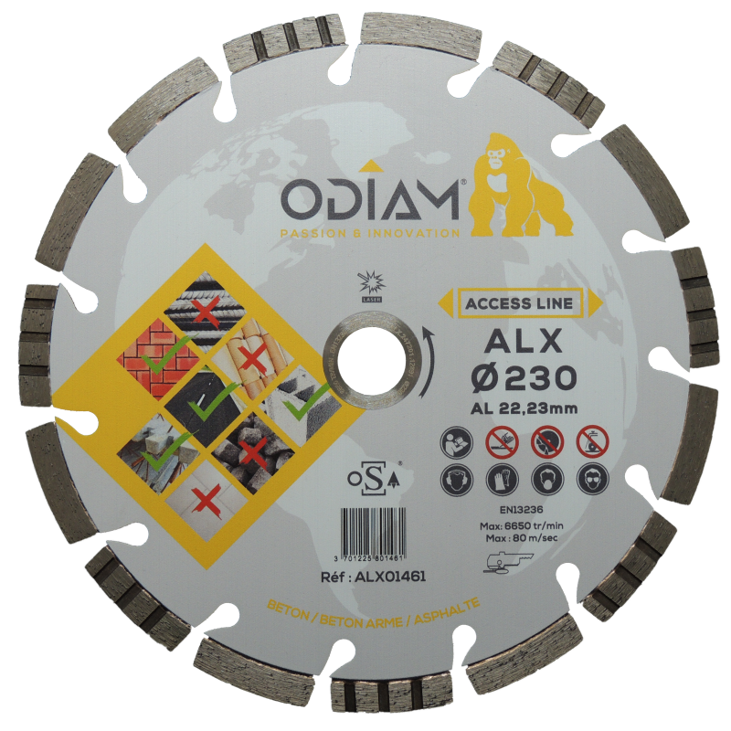 Soudure laser. Segments alternés pour une utilisation aussi bien dans les matériaux durs que dans les matériaux abrasifs.