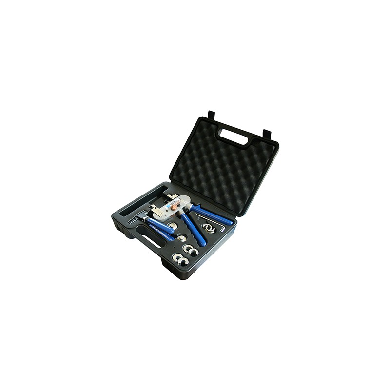 Coffret complet contenant la pince à évaser, la pince à glissement et tous les adaptateurs et butoirs nécessaires au montage.
