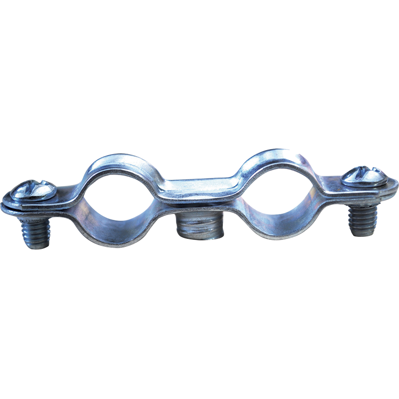 Collier double accessoires de fixation. Gamme permettant d'assurer la fixation au mur des tubes cuivre. Elle se compose de colliers, rosaces et patte à vis.