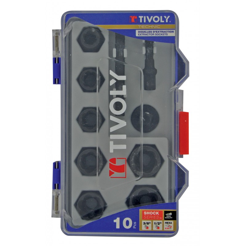 Votre écrou est patiné ? Impossible de l'extraire avec une douille, une clé ? La douille d'extraction avec ses 6 mâchoires affûtées est là pour "mordre l'écrou" et l'extraire sans difficulté. 7 douilles Ø10-11-12-14-16-17-19 mm + 1 adaptateur 1/2 "- 3/8" + 1 rallonge 3/8", hexa 6,35 mm + 1 barre d'extraction